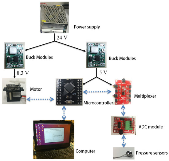 The dexterous hand circuit system is mainly composed of four systems: ADC processing system, power management system, motor drive system, and communication system. The control system shown in Figure 10, where the black realization indicates the power supply relationship and the blue dotted line indicates the communication relationship between the modules. The ADC processing system amplifies, operates, converts, and streams the differential signals from the sensors into the multiplexer in the form of IIC data streams. This method can improve the sensor’s anti-interference ability to a greater extent, and also makes the motor drive compatible with the sensor’s long-wire transmission. Power management system adopts power matching mode for distributed management. Intelligent voltage reduction chips are used to effectively distribute the specific energy consumption, voltage, and current required by each system to achieve differentiated management of power and energy consumption. The linear motor drive system used to control the wrist motion utilizes a full H-bridge drive circuit that provides precise closed-loop control of the drive’s direction, speed, position, and current through pulse width modulation.