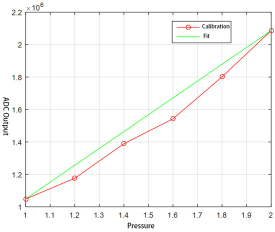Since the sensors are subjected to pressure generated by the structure itself after assembly, and the effects vary depending on the installation, the sensors mounted in the fingers need to be calibrated. Vertical pressure is applied to the tip of the index finger using weights of 1 kg, 1.2 kg, 1.4 kg, and 1.6 kg, respectively. The three-byte hexadecimal data read by the upper computer is then converted into decimal numbers. The calibration curve and its fitting curve are shown in Figure 11.