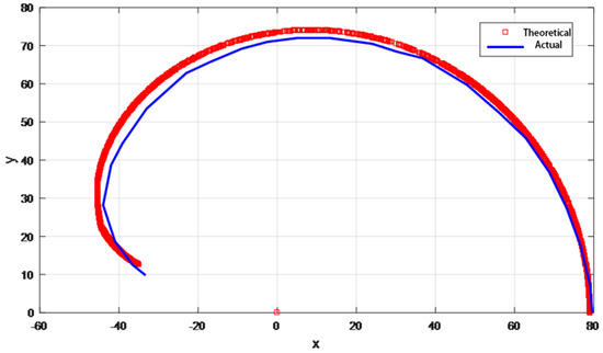 The relationship between the obtained joint angles was used to plot the motion trajectory of the index finger tip in Matlab software as shown in the red curve in Figure 12. The accuracy of the theoretical path is verified by the path measurement experiment, where a single index finger is fixed vertically on the profile, and the tendon rope is pulled by the motor with a speed of 3 mm/s in the direction of gravity at a constant speed, and the motion process of the index finger is photographed with a camera and randomly taken as a point. The coordinates of each point are recorded, and the motion path of the index finger is plotted as shown by the blue curves in Figure 14. The deviation between the experimental trajectory and the theoretical trajectory in the figure is mainly caused by the frictional resistance of the tendon rope in motion, resulting in an unstable motion relationship between the three joints, in which the largest error point is about 3 mm, which is 12.5% of the width of the finger, and can be ignored.