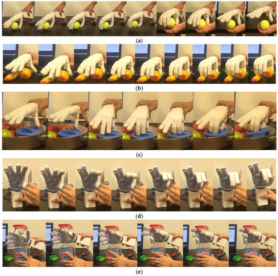 In order to further demonstrate the working ability of the underactuation dexterous hand, objects in different environments are grasped in the stationary state of the target object. The characteristics and advantages of the underactuation dexterous hand are analyzed based on the dynamic working process. Since the size of the dexterous hand designed in this paper is similar to that of a human hand, the dexterous hand is fitted with dispensing labor gloves to increase the friction coefficient of the finger surfaces to improve the grasping performance, as shown in Figure 16. Figure 16a records the process of grasping and releasing a tennis ball by the dexterous hand, and the adaptive grasping process of the fingers according to the contour of the target object is visible in the figure. Figure 16b records the grasping process of the dexterous hand on a peach, in which the presence of an obstacle near the target object is visible, but due to the flexible joints and adaptive motion of the dexterous hand, the obstacle did not have an effect on the grasping of the target object. Figure 16c records the grasping process of the dexterous hand on the lid, due to the specific shape of the lid cannot accommodate more than one finger, five-finger or four-finger linkage of the hand cannot be grasped, while the dexterous hand designed in this paper except the thumb of the four fingers can be driven two by two individually, so it can be grasped on this type of object. Figure 16d records the grasping process of the dexterous hand on the student card, for the thin sheet-type object, the contact area of the finger side pinch is larger compared to that of the fingertip pinch, so the finger side pinch can achieve a more stable grasping effect, while the thumb of the dexterous hand designed in this paper has two driving degrees of freedom, which can achieve the independent bending of the thumb. In the figure, it can be seen that the bending force of the thumb can fall on the side of the index finger, which can stabilize the pinching of the thin sheet-like objects. Figure 16e records the process of the dexterous hand’s use of the spray bottle. In the figure, it can be seen that the dexterous hand firstly grasps the spray bottle stably through the thumb, ring finger, and little finger, and then drives the index finger and middle finger to bend to pinch the handle of the spray bottle, which is a skillful way to complete the use of the spray bottle. It can be seen that, because the dexterous hand designed in this paper has four degrees of freedom of drive, it can change the sequence of the four degrees of freedom of drive to achieve more complex operations, and has a greater potential for application.