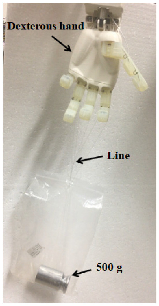 The four fingers of the dexterous hand were driven to bend to appropriate positions. While the servos were enabled, bags containing weights of 200 g, 300 g, 400 g, and 500 g were hung on the fingers to simulate the posture of a human hand lifting a heavy object. Each test was maintained for 30 s to evaluate the dexterous hand’s ability to grip a 500 g weight under practical conditions. As shown in Figure 17, the dexterous hand demonstrated stable performance, successfully lifting the 500 g weight without any functional issues.