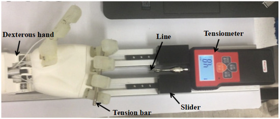 Active grasping platform is shown in Figure 18, simulating the principle of grip strength meter. The dexterous hand end is fixed at one end of the two aluminum profiles. The other end of the profile is placed in the digital tensile tester. The slider on the profile blocks the tensile tester’s shoulders. The head of the tensile tester is tied to the end of the fishing line, and the other end of the line is tied to the pull rod. The pull rod falls naturally on the four fingers under the effect of gravity. To control the PWM, the four fingers gradually bend and adaptively hook the pull rod under the action of the differential mechanism to apply force to the palm direction. The position of the slider is adjusted so that the force gauge is moved back and the experiment is repeated until the slider is moved back to the point where the fingers cannot hold the lever. For the maximum PWM, the maximum active grip force of 4.8 N. Due to the limited length of the fingers, it can be verified that the dexterous hand can provide an active grip force with a maximum of 4.8 N under this experimental platform. Since testing the grip force limit would destroy the motor, no additional load experiment was conducted to test its maximum grip force while meeting the design requirements.