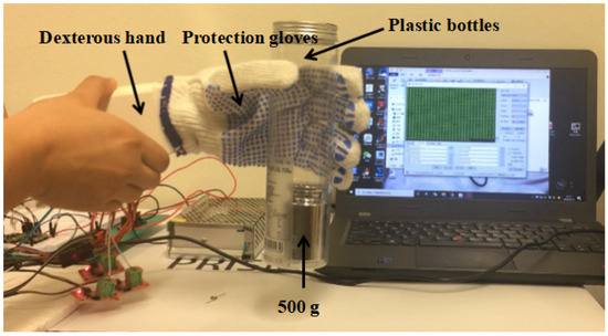 The grip-to-weight ratio represents the ratio of the weight of the object grasped vertically by the dexterous hand to the weight of the dexterous hand itself and is an important measure of the dexterous hand’s grasping ability and structural robustness. As shown in Figure 19, repeated weight grasping tests with different positions of the bottle body as the grasping points have successfully grasped 500 g weight without relative displacement, which meets the design goal. The underactuation dexterous hand designed in this paper has a total weight of 0.35 kg plus the self-weight of the forearm, and it can be seen that its gripping weight ratio reaches 1.43 kg.