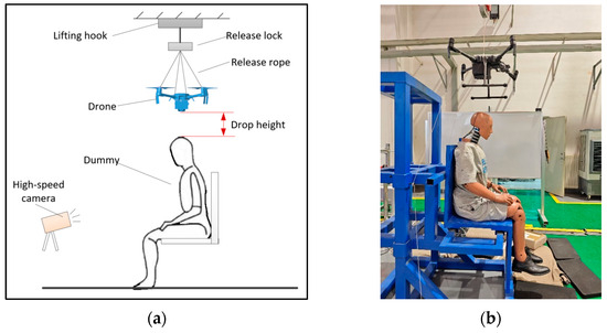 Schematic diagram and on-site photos of tests involving drone dropping and collision with dummy; (a) Schematic diagram of the experiment setup; (b) On-site photos of the setup.