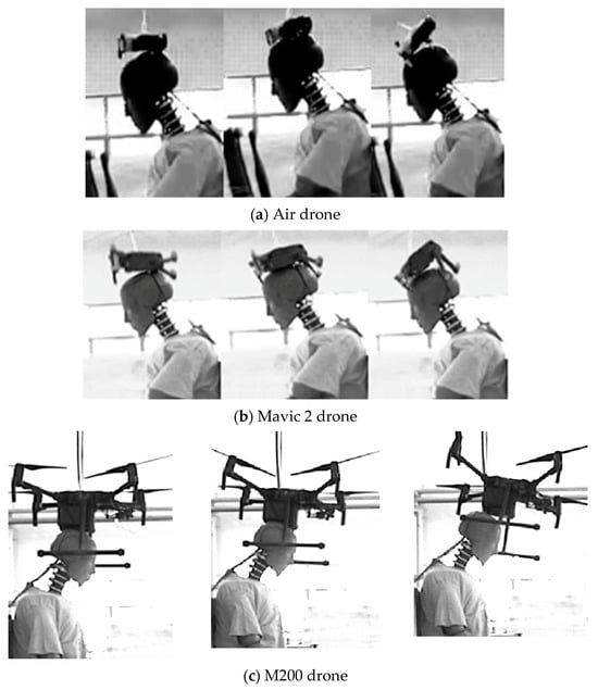 The typical processes of the drones dropping and impacting the dummy head are depicted in Figure 3. For the Air drone, with the collisions, the dummy neck bended forward, the body of the drone underwent deformation, and its arms were broken. Subsequently, the drone rebounded and rolled due to the reaction force. Although the collision process from different heights was basically similar, the forward flexion of the dummy neck and the deformation level of the drone increased with increasing drop height. For the Mavic 2 drone, after the drone body impacted the dummy head, the dummy neck flexed forward, and the drone arms were deformed. The Mavic 2 drone, whose arms are longer compared to those of the Air drone, experienced a more significant bending moment during the collision, resulting in more pronounced bending. For the M200 drone, the battery of the drone, which is located at its bottom and occupies a significant portion of it, primarily impacted the dummy head. During collision, the dummy neck flexed forward, and the flexion was more pronounced compared to that of the other two drones.