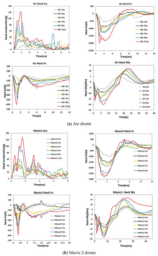 Figure 4a illustrates the head resultant acceleration, neck force, and neck-bending moment of the dummy after collision with the Air drone from different drop heights. The response curves of the dummy head and neck exhibited similar trends with time. The head acceleration curve demonstrated a rapid increase, peaking at 1 ms, followed by a gradual decrease. The peak acceleration value increased progressively with increasing drop height. As regards the neck response, the change in shear force was more pronounced than that of the axial force, quickly falling to nearly zero after peaking. Both the axial force and bending moment of the neck decreased after reaching their peak values, persisting for some time. Initially, the neck-bending moment was negative, causing the dummy neck to extend backward. As the collision progressed, the drone compressed the dummy head, with the bending moment transitioning gradually from negative to positive, and the neck shifting gradually from extension to forward flexion. After the collision, the neck-bending moment decreased gradually to zero.