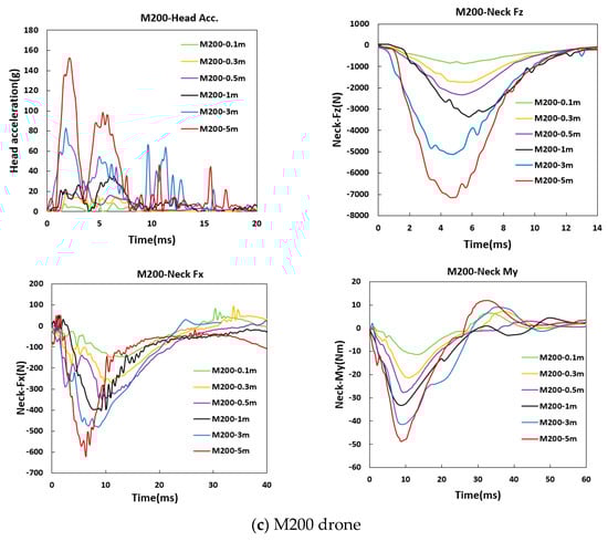 Figure 4c illustrates the head resultant acceleration, neck force, and neck-bending moment of the dummy after collision with the M200 drone from different drop heights. The maximum head acceleration, neck axial force, neck shear force, and neck-bending moment values increased with increasing drop height. Compared to the Air and the Mavic 2 drones, the peak values of the M200 drone were larger at the same drop height. All three drones exhibited a similar head acceleration pattern, with distinct double peaks at the initial collision moment, which were followed by oscillations that became wider with increasing drone mass. Unlike the Air drone that exhibited a peak at the initial collision moment, the neck axial force of the M200 drone was more similar to that of the Mavic 2 drone, since there was no significant stiffness change at the collision site. The trend of the neck shear force was similar among all three drones. As regards the neck-bending moment, there was a certain delay compared to the neck forces (axial and shear forces). The neck-bending moment reached its peak when the neck force dropped to zero. This behavior was consistent with that of the Air and Mavic 2 drones; however, the neck-bending moment of the M200 drone did not exhibit significant double peaks. This difference may be due to the collision of the M200 drone with the dummy, which not only caused neck deformation but also propelled the entire dummy forward due to its larger mass, thereby canceling out the oscillations of the neck-bending moment.