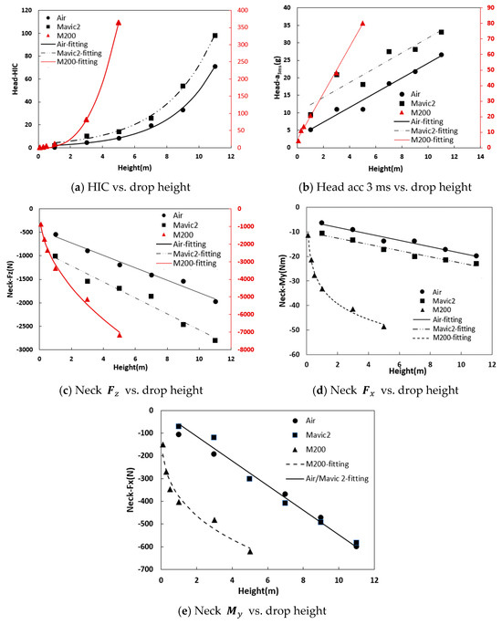 The trends of the injury metrics with respect to the drop height were not identical. The head HIC for all three drones exhibited an exponential increase with height, while head acc 3 ms increased linearly. The increase rate of HIC and head acc 3 ms was higher for the M200 drone compared to the other two drones. The neck injury metrics (, , and ) for the Air and Mavic 2 drones exhibited a linear increase with increasing drop height; on the other hand, the neck axial force () and shear force () for the M200 drone increased as a power function, while the neck-bending moment () followed a logarithmic growth relationship.