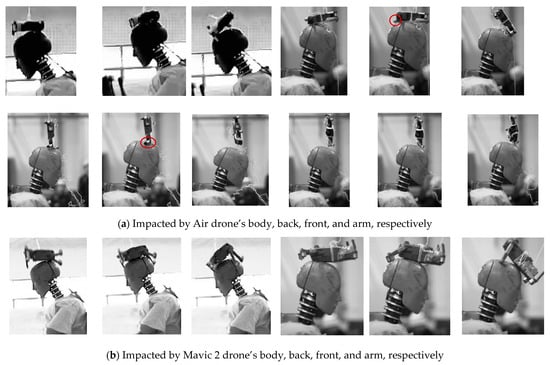 Figure 6b illustrates the changes in the dummy posture after collision with different positions of the Mavic 2 drone. When the Mavic 2 body and back collided with the dummy head, the drone arms experienced significant deformation and bending due to inertial forces, causing it to roll forward and fall off the dummy head. In the collisions between the Mavic 2 front and the dummy head, the elasticity of the drone front caused it to bounce off. During impact with the Mavic 2 arms, the motor bracket that mounts the rotors deformed first, which was followed by overall bending of the arms, causing the drone to deviate and fall off. The dummy neck exhibited certain forward flexion under all impact scenarios.