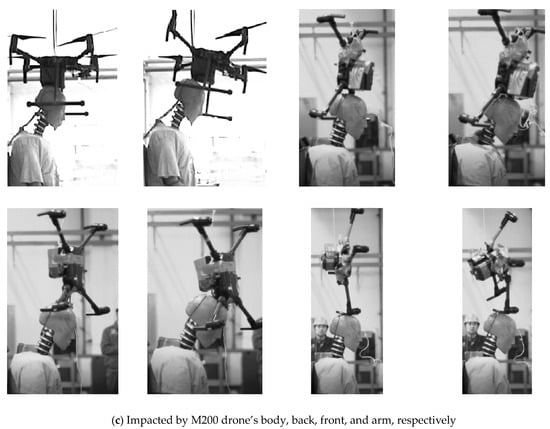 Due to the structural differences between the M200 drone and the other two drones, impact tests were conducted with four different positions of the drone: body, front, tail, and arms. Figure 6c illustrates the responses of the dummy to the collision from these different positions. When the M200 body impacted the dummy head, the battery beneath the body collided with the head, causing significant forward flexion of the dummy neck, while the drone slid off the front of the dummy head. In the M200 tail collision scenario, both the tail and the battery struck the dummy head, resulting in a posture change similar to that observed under the body collision. During the M200 front collisions, the camera mounted on the drone front collided with the dummy head, gradually deforming and breaking, before sliding off the top of the dummy head. During the M200 arm collisions, the arms experienced severe bending damage from the strong impact and slid off the side of the dummy head, causing forward flexion of the dummy neck. Overall, due to the heavier mass of the M200 drone, the dummy neck exhibited more pronounced forward flexion compared to that under the other two drones.