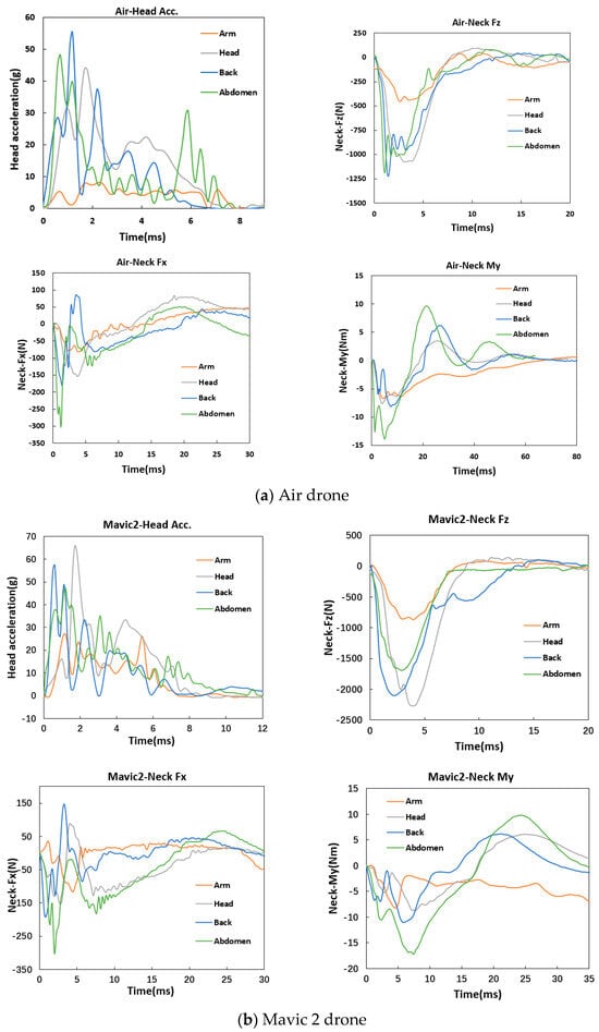Figure 7b presents the dynamic responses of the dummy head and neck to collisions by distinct positions of the Mavic 2 drone. Due to the structural similarities between the Mavic 2 and Air drones, the head and neck response patterns were also similar. As regards the Air drone, the arm collisions resulted in the weakest head and neck responses. More specifically, the peak head acceleration values for the Mavic 2 front, back, and body collisions were similar and significantly higher than those for the arm collisions. The trends of the acceleration curves showed that, similar to the Air drone, the collisions from the Mavic 2 back and front positions caused greater oscillations to the dummy head acceleration compared to those from other positions. The peak neck axial force patterns from the different impact positions were consistent with those for the acceleration. The highest peak occurred from the Mavic 2 front collisions, followed by slightly lower peaks from the Mavic 2 back and body collisions, with the arm collisions resulting in the lowest peaks. The peak neck shear force and bending moment values that occurred from Mavic 2 collisions and their overall trends were similar to those observed with the Air drone.