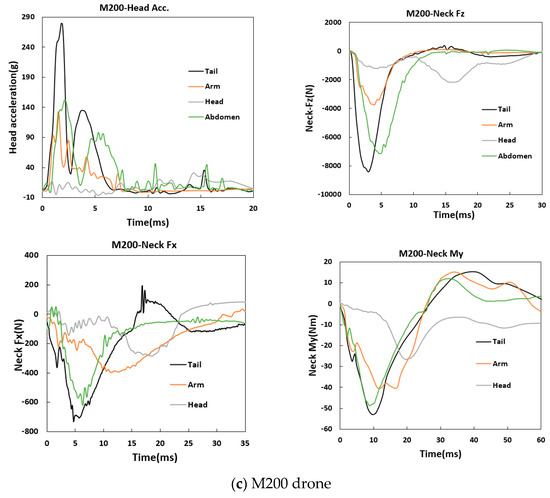 Figure 7c shows the dynamic responses of the dummy head and neck to collisions by distinct positions of the M200 drone. The highest peaks in the head and neck occurred from M200 tail collisions, while the lowest ones occurred from M200 front collisions. In particular, as regards the head acceleration, the M200 tail collisions produced the highest peaks, followed by those from body and arm collisions, with the head collisions resulting in significantly lower peaks. The acceleration curves from M200 tail and body collisions were similar, both exhibiting two distinct peaks. This is attributed to the M200 battery, which occupies a significant portion of the drone, and impacted the dummy head during both body and tail collisions. The big stiffness of the battery resulted in significant impact forces, causing an initial acceleration peak as the dummy head moved downward under impact and a secondary peak during compression. Under the M200 front collisions, the camera contacted the dummy head first, causing gradual compression in neck axial force. For the low stiffness of the camera, the head acceleration was the lowest among all impact cases. Under arm collisions, the acceleration initially increased and then decreased as the arms bent. The patterns of the peak neck axial force values were similar to those for the head acceleration, with the highest peak occurring under M200 tail collisions and the lowest under head collisions. The curves for the tail, body, and arm collisions exhibited a similar trend, i.e., increasing first and then decreasing to zero. Moreover, the neck overall lower stiffness indicated that it did not exhibit the two-peak pattern observed in the head acceleration. During the M200 front collisions, the axial force was initially low and increased as the camera underwent gradual compression. As to the neck shear force and bending moment, the highest peaks occurred under M200 tail collisions, with the lowest under head collisions. The overall trends of the curves from the M200 body, tail, and arm collisions were similar, with peaks occurring later under arm collisions than under tail and body collisions, likely due to the deformable characteristics of the arms during the collision. The shear force and bending moment curves from head collisions differed from those from the other positions, exhibiting a significant increase of about 10 ms after collision, likely due to the increased stiffness resulting from the compression of the camera.