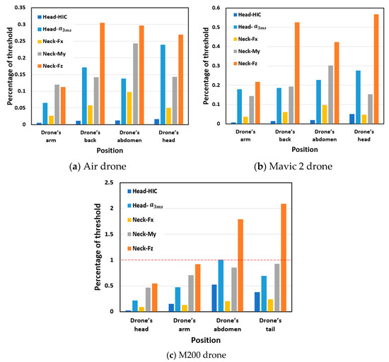 Dummy’s percentage of threshold induced by the impact of drones’ different positions.