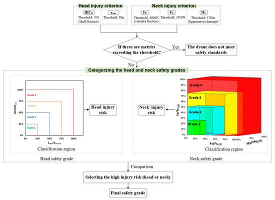 Referring to the basic idea of Austen et al. [29], this study presents a procedure for determining the safety grades of drone collision with dummy. The procedure is outlined in Figure 9. To evaluate head and neck injury from drone collisions, various metrics are extracted and compared against threshold values. If a metric exceeds its threshold, this indicates that the drone has caused injury and fails to meet safety standards. Conversely, if none of the metrics surpass their thresholds, the safety of head and neck injury is classified. Subsequently, the injury risks for the head and neck are compared, and the higher risk is adopted as the final collision safety grade of the drone.