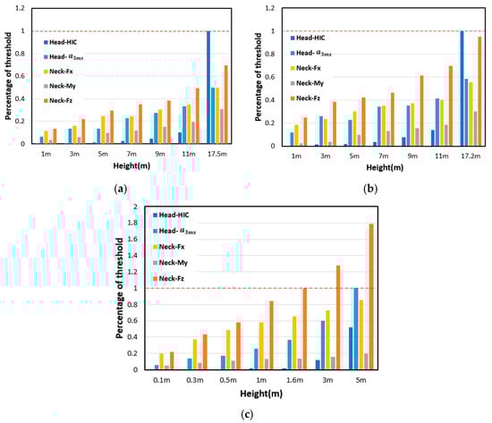 Percentage of threshold for the three typical drones under different drop heights; (a) Air drone, (b) Mavic 2 drone, (c) M200 drone.