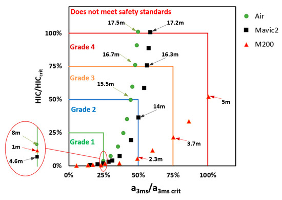 To determine the safety grades associated with the drop heights of the three typical drones, the head and neck injury metrics (HIC, head acc 3 ms, , , and ) were calculated and compared with the corresponding threshold values under different drop heights (Figure 10). It was found that, as regards the Air and Mavic 2 drones, the head HIC exceeded the threshold value when the drop height exceeded 17.5 m (Air) and 17.2 m (Mavic 2), while, as regards the M200 drone, the neck axial force reached the threshold value at a height of 1.6 m.