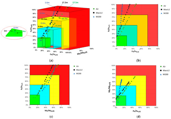 Classification of neck safety grades for the three typical drones falling from different drop heights; (a) Neck safety grade classification, (b) Neck shear force vs. axial force, (c) Neck-bending moment–axial force, (d) Neck shear force vs. bending moment.