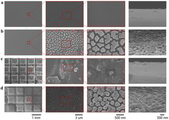 The top and side surfaces of four samples—P-PDMS, NA-PDMS, M-PDMS, and MNC-PDMS—were examined using a scanning electron microscope (SEM). As shown in Figure 2, the surface of P-PDMS exhibits excellent flatness, with no protrusions visible on either the front or side surfaces (Figure 2a). The NA-PDMS displays a columnar structure under electron microscopy (Figure 2b), with nanofiber arrays of varying sizes obtained by using AAO templates of different dimensions (Figure S3). The M-PDMS and MNC-PDMS, formed by laser etching, display 1 mm × 1 mm ridges under electron microscopy (Figure 2c). The ridge height varies with the laser etching time (Figure S4). The groove height after 30 times of laser etching is about 400 μm. The MNC-PDMS reveals the nanofiber array within the platform, and laser treatment does not damage the nanofiber array structure (Figure 2d). SEM characterization confirms the successful preparation of four sample types: P-PDMS, NA-PDMS, M-PDMS, and MNC-PDMS. The laser etching time, spacing, AAO template parameters, and other factors can be precisely controlled. This allows for precise control over the formation of microstructures at the parameter-controlled interface.