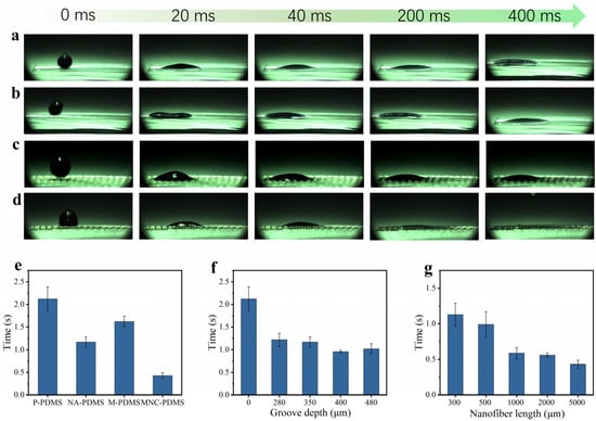 To characterize the liquid spreading performance of the four samples, we conducted wettability tests using a high-speed camera on the following samples: P-PDMS, NA-PDMS, M-PDMS, and MNC-PDMS. It was observed that all four materials exhibited rapid liquid spreading after hydrophilic treatment. Among these, the microchannel nanofiber array composite PDMS achieved liquid spreading within 430 ms, faster than the other three samples. The spreading speed follows the order MNC-PDMS > M-PDMS > NA-PDMS > P-PDMS. The increased diffusion velocity along the microchannel accelerates the diffusion process within the nanofiber array domain (Figure 3a–d). Further research indicates that the height, width, and depth of the microchannels, as well as the nanofiber array, significantly influence the liquid spreading speed. The spreading speeds of the four sample types—P-PDMS, NA-PDMS, M-PDMS, and MNC-PDMS—are compared. In terms of spreading speed, microchannels have a greater influence than nanofiber arrays, and the combined effect of both is superior. The MNC-PDMS completes spreading in only 430 ms (Figure 3e). The spreading speed of the liquid also varies with different etching depths. Test results show that the spreading effect is optimal when the laser etching depth is 400 μm (Figure 3f). The liquid spreading speed is influenced by the height of the nanofiber array columns. Test results indicate that a greater height of the nanofiber array results in a better spreading effect (Figure 3g).