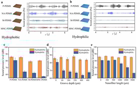 To verify the noise reduction capabilities of samples with superior spreading performance, we conducted frictional vibration noise tests on four samples—P-PDMS, NA-PDMS, M-PDMS, and MNC-PDMS—before and after oxygen plasma treatment. The test results are presented as follows. Before hydrophilic treatment, the noise levels of P-PDMS and NA-PDMS were nearly identical, the noise is about 85 dB, while the noise levels of M-PDMS and MNC-PDMS were approximately 80 dB. This is attributed to the microchannel groove structure’s ability to store friction debris, which impedes rapid liquid spreading on the surface, thereby rendering the nanofiber array ineffective in noise reduction (Figure 4a). Following hydrophilic treatment, the four materials exhibited varying noise levels, ranked from highest to lowest as follows: P-PDMS, NA-PDMS, M-PDMS, and MNC-PDMS. Among these, the hydrophilic MNC-PDMS exhibited stable frictional vibration waves over time, without irregular noise (Figure 4b). Next, we measured the average noise pressure levels of the four samples—P-PDMS, NA-PDMS, M-PDMS, and MNC-PDMS—before and after hydrophilic modification. The sample exhibiting the best noise reduction effect was the MNC-PDMS, which corresponds to its superior liquid rapid spreading ability. This resulted in a reduction of frictional vibration noise from 80 dB to 60 dB (Figure 4c). To investigate the relationship between liquid spreading speed, microgroove depth, and noise, we compared the noise reduction effect of microgrooves at various depths. The results indicated that noise was minimized when the groove depth is 400 μm. We speculate that excessive depth reduces liquid wetting of the surface, leading to dry friction and intensified self-excited vibration, warranting further investigation (Figure 4d). To explore the relationship between liquid spreading speed, nanofiber array size, and noise, we compared frictional vibration noise before and after hydrophilic treatment on samples at five different depths: 300 nm, 500 nm, 1000 nm, 2000 nm, and 5000 nm. We found that as the depth increased, the noise level decreased following hydrophilic treatment, which was attributed to the faster liquid spreading speed (Figure 4e).