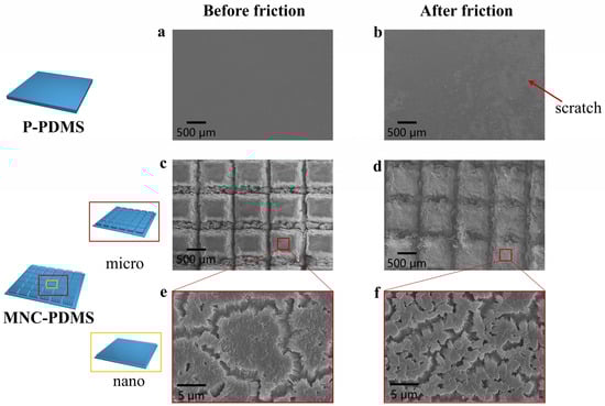 To demonstrate the superior liquid spreading ability of the hydrophilic microchannel nanofiber array composite structure, which can reduce self-excited vibrations caused by friction, we tested the long-term friction and wear performance of the hydrophilic plane and hydrophilic microchannel nanofiber array composite structure. We conducted over 1500 cyclic of friction testing on both the hydrophilic planar structure and hydrophilic microchannel nanofiber array composite structure samples under identical testing conditions. Figure 5 illustrates the surface morphology of the two materials before and after frictional vibration noise testing, as observed using a scanning electron microscope. As shown in Figure 5a,b, after undergoing multiple friction cycles, the planar structure’s surface experiences significant self-excited vibrations due to friction, resulting not only in high noise levels but also in friction-induced scratches aligned with the sliding direction. This phenomenon is attributed to the stick-slip behavior at the friction contact surface, where noise arises from the continuous deformation and rebound vibrations of the material during the unstable sliding process. In contrast, the hydrophilic microchannel nanofiber array composite structure maintains well-preserved micro- and nanoscale morphology before and after friction, with no visible friction marks and reduced self-excited vibrations (Figure 5c–f). In addition, the stretchability properties of P-PDMS, NA-PDMS, M-PDMS, and MNC-PDMS are shown in Figure S5. The Young’s modulus of P-PDMS is 1.50 MPa, and after etching 400 μm, the Young’s modulus of MNC-PDMS is 1.22 MPa; this only decreases by 0.28 MPa, which can be said to not affect the mechanical strength.