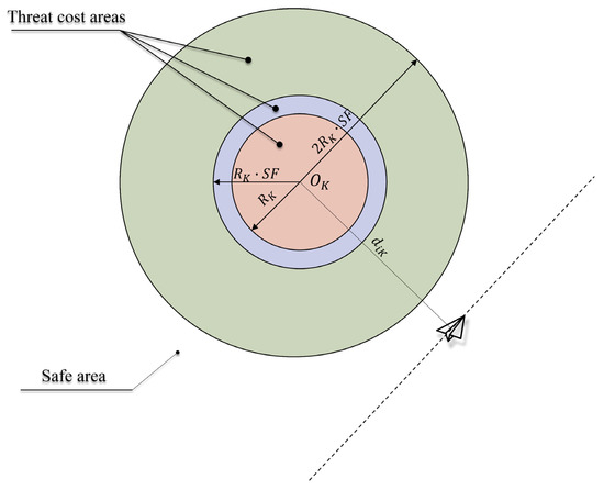 where denotes the centroid coordinates of the th threat zone; denotes the radius of the th cylindrical threat zone; is the safety factor for threat zones (1.2 in this study).