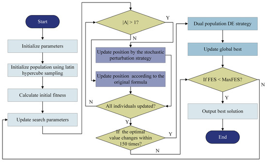 First, Latin hypercube sampling combined with an elite strategy [39] is employed during initialization to ensure a more uniform population distribution and enhance global search efficiency. Second, a stochastic perturbation strategy inspired by the Whale Optimization Algorithm is integrated to improve the algorithm’s ability to escape local optima. Finally, a staged dual-population co-evolutionary strategy incorporating multiple differential evolution variants is introduced. The population is divided into two subpopulations based on their adaptive capabilities. Considering the dynamic trade-off between exploration and exploitation during optimization, different differential evolution variants are assigned to the two subpopulations at various evolutionary stages. Additionally, the elite population obtained during initialization is leveraged to guide the differential mutation process, improving the balance between exploration and exploitation and enhancing the algorithm’s global optimization capability.