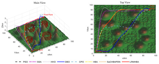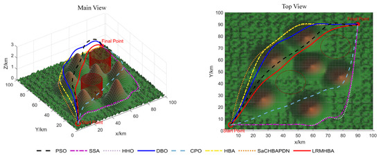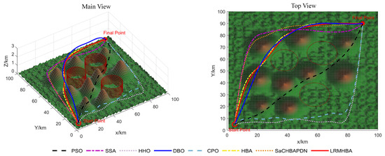 Corresponding to such a complex constraint optimization problem as path planning, scholars have proposed some algorithms and improvement studies. Traditional path planning methods include the A-star algorithm [3], Artificial Potential Fields (APF) [4], and RRT* [5], etc. These algorithms appeared earlier, developed more maturely, and were relatively simple to implement, but for path planning in complex environments, problems such as slow convergence speed would occur. In recent years, swarm intelligence algorithms have become an important method to solve the path planning problem, and this meta-heuristic algorithm simulates the information sharing and mutual learning between biological individuals in nature, with stronger self-learning, self-adaptation, and self-organization [6,7,8,9]. Some algorithms with superior performance are widely used in UAV path planning, including Particle Swarm Algorithm (PSO) [10], Artificial Bee Colony Algorithm (ABC) [11], Whale Optimization Algorithm (WOA) [12], Harris Hawks Optimization (HHO) [13], and Sparrow Search Algorithm (SSA) [14], Dung Beetle Optimizer (DBO) [15], Crested Porcupine Optimizer (CPO) [16] and so on. Li et al. [17] introduced the FP-GPSO algorithm, which uses Fermat points for grouped particle swarm optimization to address the path-planning challenge of composite unmanned aerial vehicles. Experimental findings demonstrated the effectiveness of FP-GPSO in optimizing UAV path planning. Han et al. [18] developed a multi-strategy evolutionary database to enhance the conventional artificial bee colony algorithm, leveraging their brain-inspired evolutionary learning framework to improve cognitive abilities, and simulation results show that the algorithm produces UAV trajectories with better fuel economy and higher safety. Dai et al. [19] proposed a novel whale optimization algorithm (NWOA), which improves the convergence speed and avoids local optima by using adaptive techniques and setting virtual obstacles and introduces improved potential field factors to enhance the dynamic obstacle avoidance ability of mobile robots. Tang et al. [20] improved the Harris Hawk algorithm using several strategies such as dimensional learning-based hunting (DLH) search and applied it to robot path planning, and the results demonstrated the algorithm’s clear advantage in path planning performance. Cheng et al. [21] developed an improved SSA applied to UAV path planning based on the theory of uniform experimental design and obtained good experimental results. Lian et al. [22] added exponentially decreasing inertia weights and adaptive Cauchy mutation strategies to the dung beetle optimizer to solve complex UAV path planning problems in complex 3D environments. Liu et al. [23] proposed a periodic retreat strategy and a visual-auditory synergistic defense mechanism to improve the Crested Porcupine Optimizer (ICPO) for better obstacle avoidance and reduced energy consumption of UAVs.