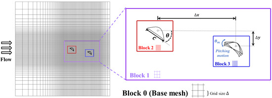 A 20c × 20c non-uniform Cartesian grid is employed for the whole flow domain. The TLMR technique to improve the mesh density is applied to the mesh setup. Two layers of blocks are arranged in the nested blocks around the near field and the foils, the refined zone with size 6c × 4c is used to capture detailed wake structures, and around the upstream and downstream airfoil, a dense region with size 1.5c × 1.5c is deployed to resolve the boundary of the foil and calculate the force production accurately.