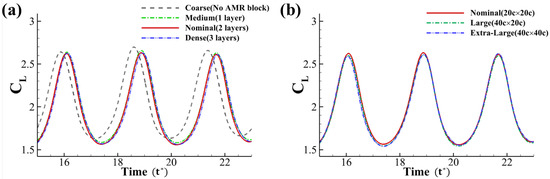 We conducted the grid- and domain-independent study using a solitary foil at AOA = 35° and Re = 1000. Figure 3a compares the instantaneous lift coefficients of the pitching foil calculated on four different grid densities. Based on the TLMR technique, by adding one more layer of block near the foil, the densest grid will be halved in size, thus doubling the mesh resolution. We generated the coarse, medium, nominal, and dense mesh by adding the base mesh, one layer, two layers, and three layers of TLMR blocks near the foil. The result shows that while the coarse and medium mesh shows a large difference in lift performance, the difference in both the peak values and the average values between the nominal and dense grid was reduced to less than 0.2%. Thus, the nominal density of the mesh was applied for all simulations.
