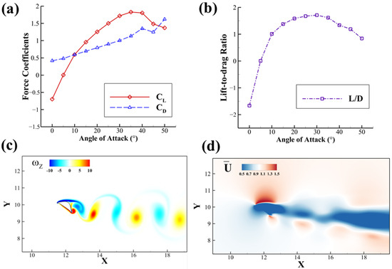 (a) Time-averaged lift coefficient , drag coefficient with different AOAs, with Re = 1000; (b) lift-to-drag ratio of a single flying snake airfoil at different AOAs; (c) vorticity contour for case AOA = 35°, Re = 1000 at peak lift production; (d) time-averaged stream-wise velocity field for the same case.