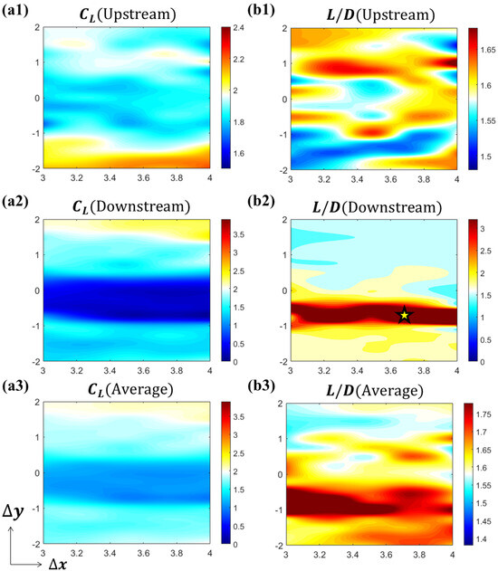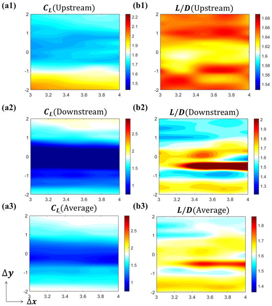 Since the performance is higher in downstream foil, the overall performance increases for the system average. A high region shown in Figure 5b3 appears in a similar region as the downstream foil. The performance results show that although the two-foil system experiences a reduction in average lift, the lift-to-drag ratio generally benefits from the interaction between the foils within a wide range of relative positions. The performance () of the downstream foil especially benefits from the interaction with the upstream foil’s wake, especially within a band of .