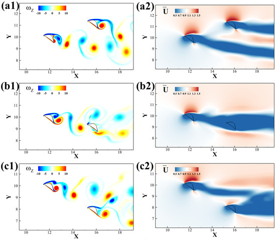 (a1–c1) vortex contours and (a2–c2) time-averaged stream-wise velocity fields of two tandem flying snake airfoils under different configurations: (a) = 3.75c, = 1.25c, (b) = 3.75c, = −0.75c, (c) = 3.75c, = −2.00c.
