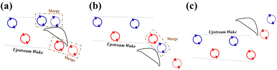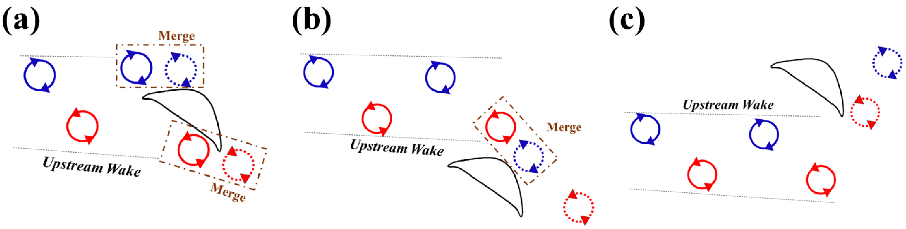 Figure 8 summarizes the primary vortex structure for different configurations of the foils. As previously mentioned, the upstream wake is a typical von Kármán vortex street. When the downstream foil is positioned in the center of the wake, both the leading-edge vortex (LEV) and trailing-edge vortex (TEV) combine with vortices generated by the upstream foil. If the downstream foil is placed below the wake, the LEV on its upper surface merges with the TEV from upstream. Conversely, when the downstream foil is situated above the wake, the TEV on its lower surface interacts with the upstream LEV.