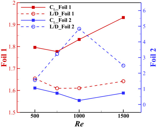 From the performance contour presented in Figure 5 and Figure 9, it can be predicted that with the Reynolds number increase, the lift production reduces in the wake region, yet the lift-to-drag ratio increases. Also, the wake region will shift slightly with the Reynolds number increase. The aerodynamic performance variation due to changes in the Reynolds number in this spatial configuration is presented in Figure 10. From the results, it can be seen that for the best lift-to-drag ratio configuration at Re = 1000, either increasing or decreasing the Reynolds number will affect the performance of the downstream snake foil, and the lift-to-drag ratio is affected more than the lift force. In summary, by adjusting the Reynolds number, the high efficiency (high ) region will shift downward when the Reynolds number increases. This further suggests that the vortex shedding direction may change and that a slight wake deviation occurs. We examine the reason behind this by analyzing the wake and vortex dynamics.