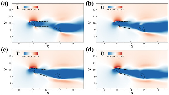 Time-averaged stream-wise velocity fields of two tandem flying snake airfoils under different Reynolds numbers: (a) Re = 500, (b) Re = 750, (c) Re = 1000, (d) Re = 1500.