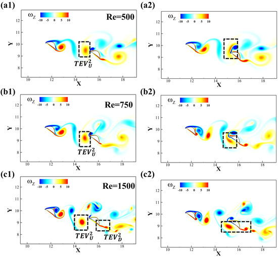 To further investigate the formation and interaction of the vortices near the downstream snake foil, the instantaneous vorticity contours at maximum lift production for different Reynolds number cases are presented in Figure 12. In Figure 12a1,b1,c1, the meets the leading edge of the downstream airfoil. Different Reynolds numbers have slightly different angles of incidence and initial position, leading to different vortex–wedge interaction patterns. In Figure 12a2, the collides with the wedge (leading edge) of the downstream foil, inducing the shedding of the LEV of the downstream foil, and then travels with it as a vortex pair over the dorsal surface. Tucker et al.’s work [41] provided similar vortex–wedge interaction profiles. By shifting the initial position of the vortex downward with the increasing Reynolds number, the vortex breakdown switches from the dorsal surface to the ventral surface, which happens in Figure 12b2 at Re = 750. As a result, the distorts and merges with the shear layer on the ventral surface. At a higher Reynolds number Re = 1500, the advects downstream without breaking down at the wedge. Figure 12c2 shows that it maintains its shape before merging and interacting with the generated at the trailing edge of the downstream foil. Similar trends of position shift along with vortex breakdown have been summarized in Refs. [42,43].