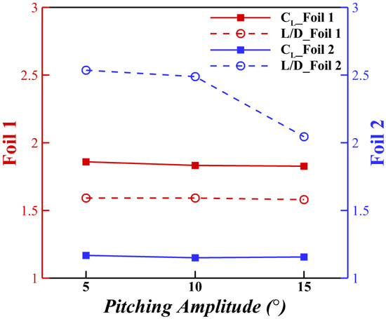 The pitching amplitude determines the angle of attack range of the trailing foil. As shown in Equation (1), the AOA for posterior airfoil can vary cyclically. The lift and drag force coefficients of varying pitching amplitudes are presented in Figure 13. As the pitching amplitude increased, the lift production on both foils decreased due to the onset of stall. This holds for the optimal ; either increasing (pitch up) or decreasing (pitch down) the AOA will worsen the lift production.
