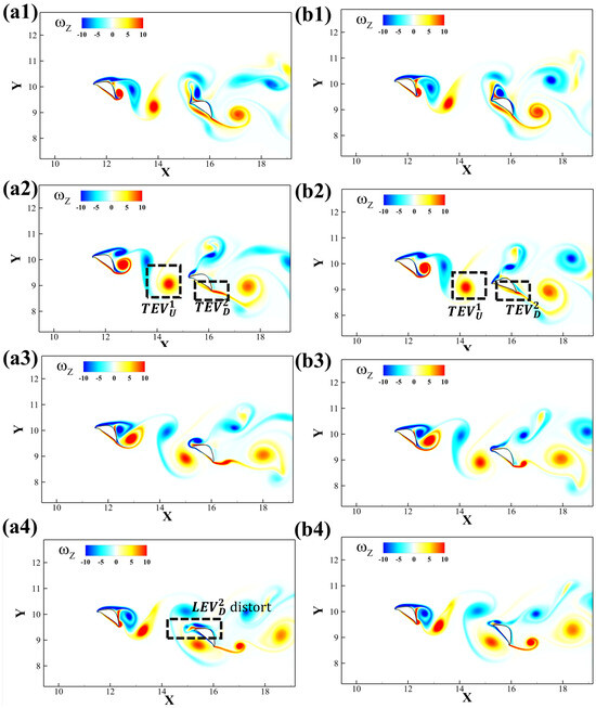 Evolutions of the vortex structures in one pitching period for the pitching amplitude 5° (a1–a4) and 15° (b1–b4). Each time frame represents 1/4 of the pitching period.