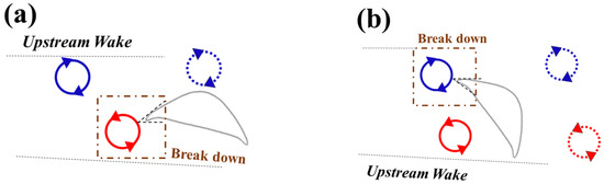Schematic of vortex interaction when the downstream foil is at (a) minimum and (b) maximum pitching amplitude.