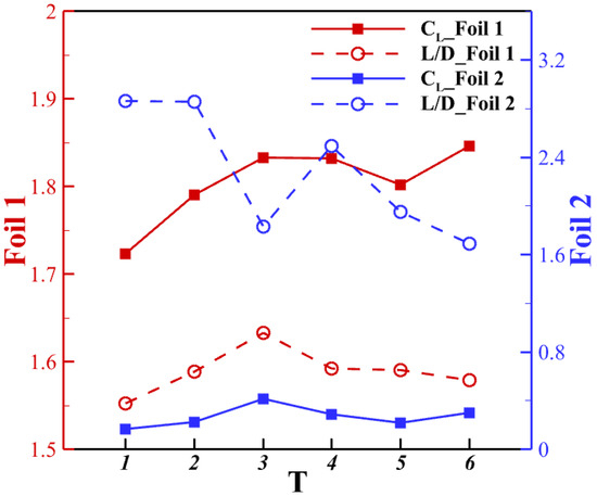 The vortex interaction contributes not only to lift production but also to the lift-to-drag ratio. At T = 1, 2, and 4, the ratio of the downstream foil reaches a higher level than others. The picked-out cases show integer multiples of pitching frequency, where the vortex interaction is synchronized with each other.