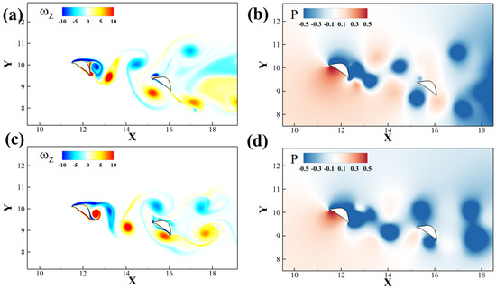 The time-averaged aerodynamic performance is presented in Figure 16. It is observed that for the upstream foils, the lift production and the lift-to-drag ratio will be affected by the interaction with the downstream airfoil, but only within 5 %. The downstream airfoil’s performance changes significantly with the pitching frequency. At T = 3, when the pitching motion is synchronized with vortex shedding from the upstream wake, it will provide a high lift production. Figure 17a shows the differences in vortex patterns for different frequencies, at their respective instants of peak lift production. Figure 17c shows a different pattern by comparing the same time frame of peak lift for downstream foil. In Figure 17b,d, the pressure contour near the upstream foil shows a similar pattern of strong negative pressure on the dorsal surface in both pitching frequencies, yet the pressure difference is higher at T = 3 since the upper surface does not have a low-pressure region. For the downstream foil, the pressure difference of the T = 3 is more considerable, thus leading to the 93% increase in lift production compared with T = 5.