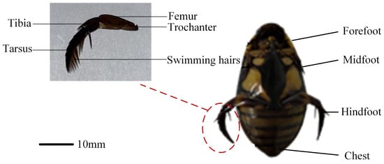 Through observing the morphological and movement characteristics of organisms, researchers can provide ideas and directions for biomimetic design and help summarize relevant design principles [21]. In this section, the diving beetle was taken as the research object. Its body morphology, leg structural features, and movement characteristics were observed and analyzed to provide a theoretical basis for the design of paddling propulsion mechanisms inspired by the diving beetle. Based on the body morphology and movement characteristics of the diving beetle, a paddling propulsion robot inspired by the diving beetle was designed.