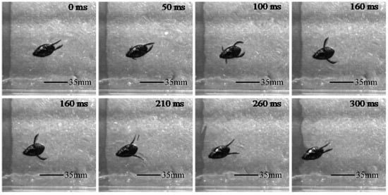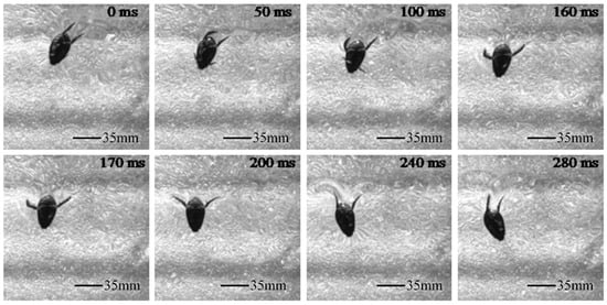 Within a single paddling cycle, the turning swimming posture sequence of the diving beetle is shown in Figure 3. As can be seen from the figure, during the paddling propulsion process, there are significant differences in the motion of the two hindfeet: one hindfoot exhibits a larger amplitude of motion and plays a primary role in turning and propulsion, while the other hindfoot has a smaller amplitude and contributes less to turning and propulsion. During the return phase (0–160 ms), the left hindfoot of the diving beetle bends with a larger bending angle, reducing resistance, while the right hindfoot first extends to paddle and then bends but with a smaller amplitude. The return phase accounts for approximately 57.1% of the entire cycle. In the stroke phase (160–280 ms), the left hindfoot fully extends and maintains this position to complete the paddling. During this phase, the stroke amplitude is large, and the swimming hairs on the hindfoot spread outward, increasing the effective paddling area and thus enhancing the propulsive force. Meanwhile, the right hindfoot first bends and then fully extends to complete the paddling, but with a smaller amplitude. The stroke phase accounts for approximately 42.9% of the entire cycle. Under the aforementioned conditions, the diving beetle rotates by an angle of 49.8° over a single cycle.
