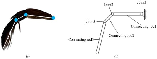 The diving beetle’s swimming foot can be simplified into a structure comprising three connecting rods and three joints. As illustrated in Figure 4, the trochanter, where it connects to the diving beetle’s body, is designated as Joint 1 and is designed as an active joint to facilitate the swinging motion of the hindfoot. The segment between the trochanter and the femur is defined as connecting rod 1. The connection between the femur and the tibia is labeled as Joint 2, and the segment between the tibia and the tarsus is designated as connecting rod 2. Joint 3 is located between the tibia and the tarsus, with the entire tarsus serving as connecting rod 3. Both Joint 2 and Joint 3 are designed as passive joints, ensuring smooth and efficient movement of the simplified structure. This anatomical breakdown and functional assignment provide a clear and concise understanding of the diving beetle’s swimming foot structure and its mechanical implications.