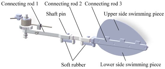 Based on the deployment characteristics of the diving beetle’s swimming hairs during swimming, the outer contour curve of the swimming hairs when they are deployed was captured. After smoothing the curve, the corresponding swimming fin was designed in proportion. Inspired by the hindfoot motion characteristics of the diving beetle, a swimming foot mechanism was designed to imitate the diving beetle’s swimming foot, as shown in Figure 5. This mechanism consists of several key components: connecting rod 1, imitating the diving beetle’s femur; connecting rod 2, imitating the tibia; connecting rod 3, imitating the tarsus; and the swimming fin, imitating the diving beetle’s swimming hairs. The length ratios of connecting rod 1, connecting rod 2, and connecting rod 3 are 9:4.5:13, consistent with the proportions of the diving beetle’s legs. Additionally, soft rubber is used to provide joint stiffness, along with connecting components such as pins, snap rings, and others.