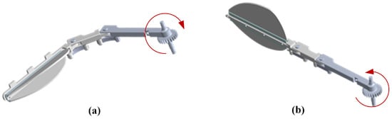 Figure 6a illustrates the structural morphology of an imitation of the diving beetle swimming foot during the return phase: the swimming foot swings forward, and the soft rubber at the joints of the connecting rods, along with the bending of the swimming fins on both sides, reduces the overall contact area between the swimming foot and water, thereby effectively lowering the resistance acting on the swimming foot. As shown in Figure 6b, during the stroke phase, the swimming foot swings backward, and the joints of the connecting rods, as well as the swimming fins on both sides, rapidly extend. Due to the limiting structure, the swimming foot maintains its extended state, which increases the contact area with water and enhances the propulsive force during the swimming foot’s stroke. Through this design, the imitation of the diving beetle swimming foot can mimic the swimming characteristics of the diving beetle’s hindfoot, achieving efficient propulsion in water.