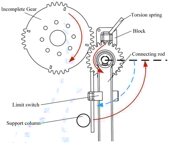 Through the application of gear-driven transmission, the swimming propulsion mechanism can achieve higher swimming frequencies. However, during the two phases of movement, the diving beetle exhibits different stroke directions. If a full-tooth gear transmission were used, the servos would need to oscillate back and forth, with varying swing frequencies in different stages within a single cycle, resulting in a highly complex control system. To address this challenge, the present study employs an incomplete gear combined with a torsion spring for the transmission mechanism, as illustrated in Figure 7. This approach allows the servos to rotate in only one direction, thereby simplifying the control system. During gear engagement (red phase), the swimming foot completes the return stroke, while during the non-engagement phase, the torsion spring releases its pre-stored energy (blue phase), driving the swimming foot to complete the power stroke. This design enables the propulsion mechanism to achieve high-frequency swimming while reducing the required servo drive frequency, ultimately enhancing swimming efficiency.