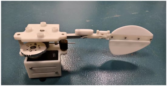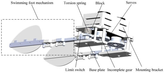 The designed components are integrated into the paddling propulsion mechanism, as shown in Figure 8. The paddling propulsion mechanism primarily consists of the swimming foot mechanism, torsion spring, incomplete gear, servos, mounting bracket, base plate, bearings, and other components. Among these, the mounting bracket serves to secure and support the various parts of the paddling propulsion mechanism. One end of the torsion spring is fixed in the block hole of the mounting bracket, while the other end is secured to connecting rod 1 via a limit switch. This design ensures the stability and robustness of the torsion spring while enabling it to provide the necessary torque for the paddling propulsion mechanism.