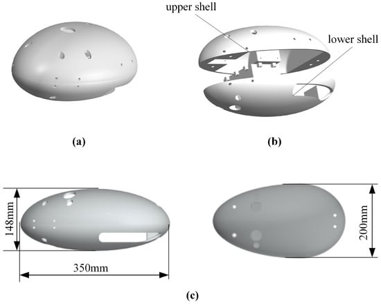 Shell design of paddle propulsion robot: (a) Schematic diagram of robot shell. (b) Robot shell decomposition schematic. (c) Dimensional drawings of housing.